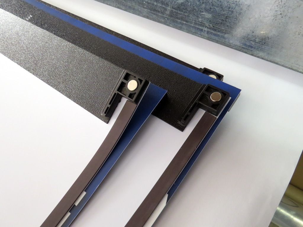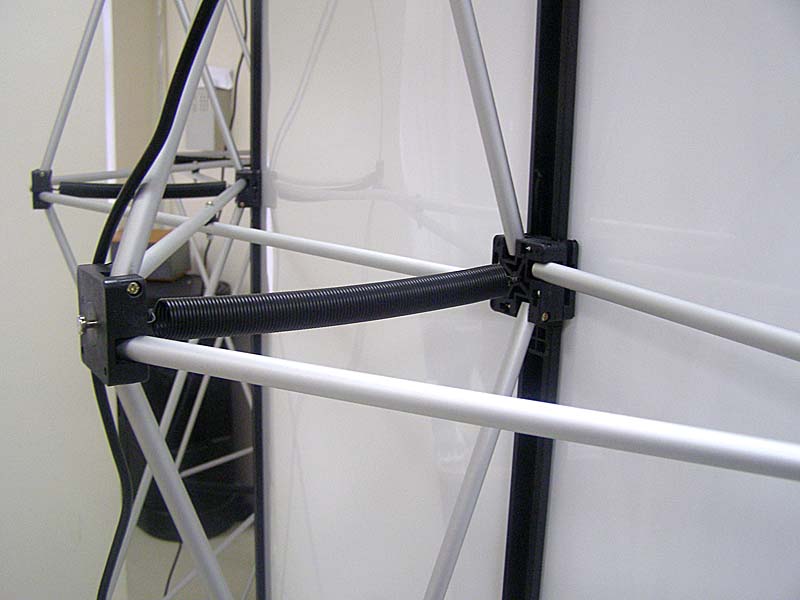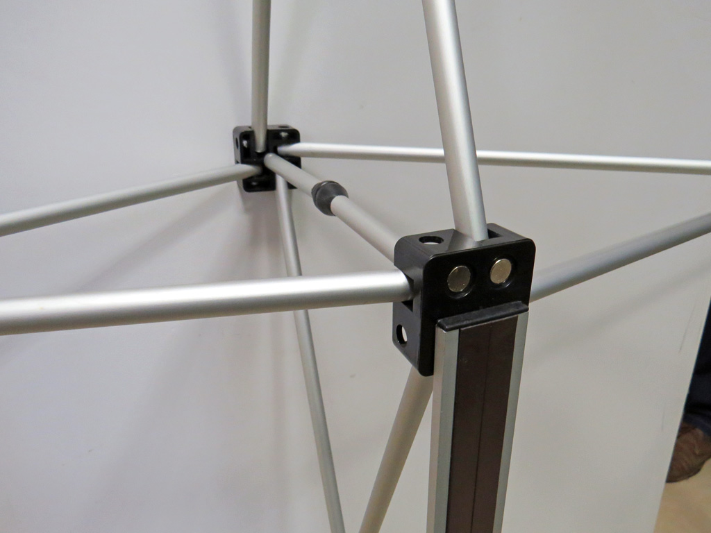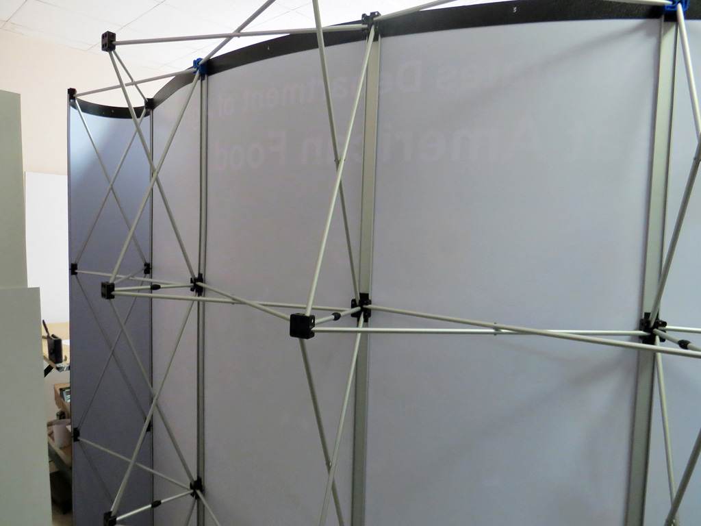 Відмінними рисами даного типу мобільних стендів є принцип дії несучої конструкції і кріплення до неї фотопанелей. Розкриваючись як парасолька, конструкція закріплюється вертикальними металевими ребрами. По краях фотопанелей наклеєна гнучка магнітна стрічка, що дозволяє миттєво прикріпити панно до виставкового стенду. Такий спосіб кріплення дозволяє отримати мобільний стенд з єдиним, великого формату фотопанно з ледве помітними швами.