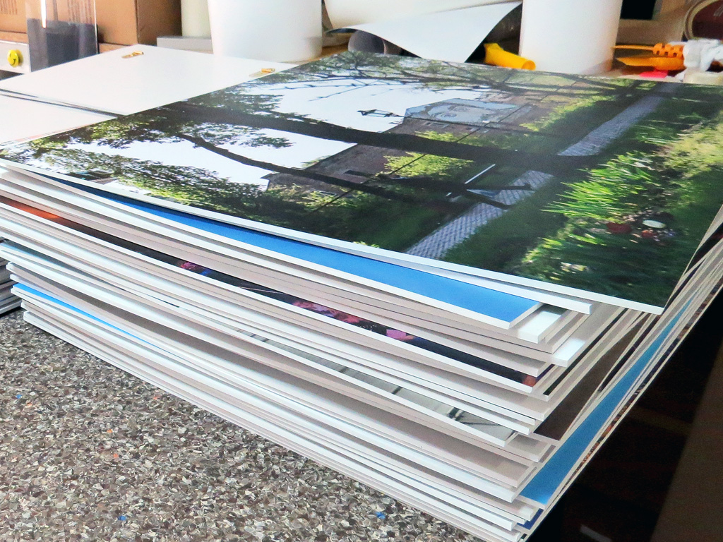 Фотографія друкується на фотовінілі, потім ламінується (ламінаційна плівка захистить вашу роботу від механічних пошкоджень) і ламінатором монтується до пластику 4 мм завтовшки (Товщина пластику може бути від 2 до 10 мм). На зворотному боці фотографії приклеюється кріплення.
